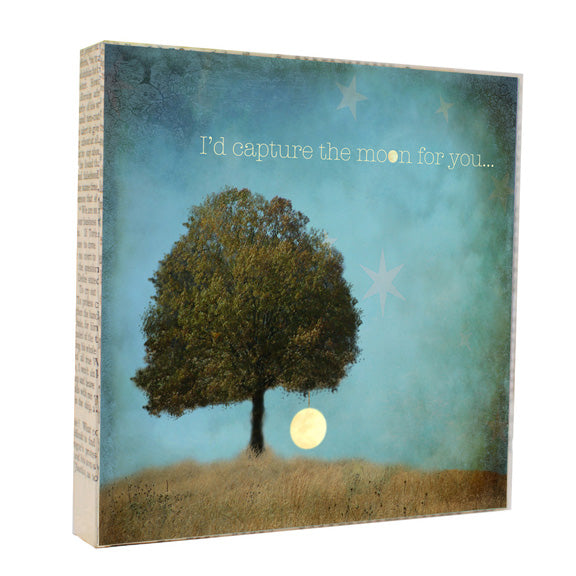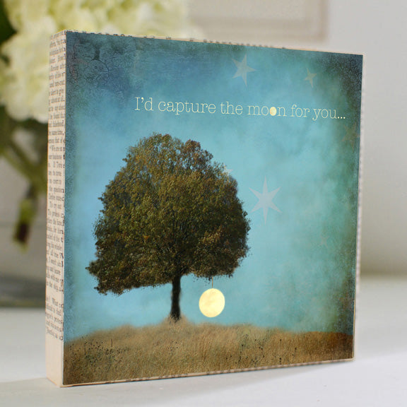 “Capture the Moon:" original artwork by Michelle Ciarlo-Hayes, carefully mounted on a reclaimed wood block that she's lovingly covered with vintage book pages.