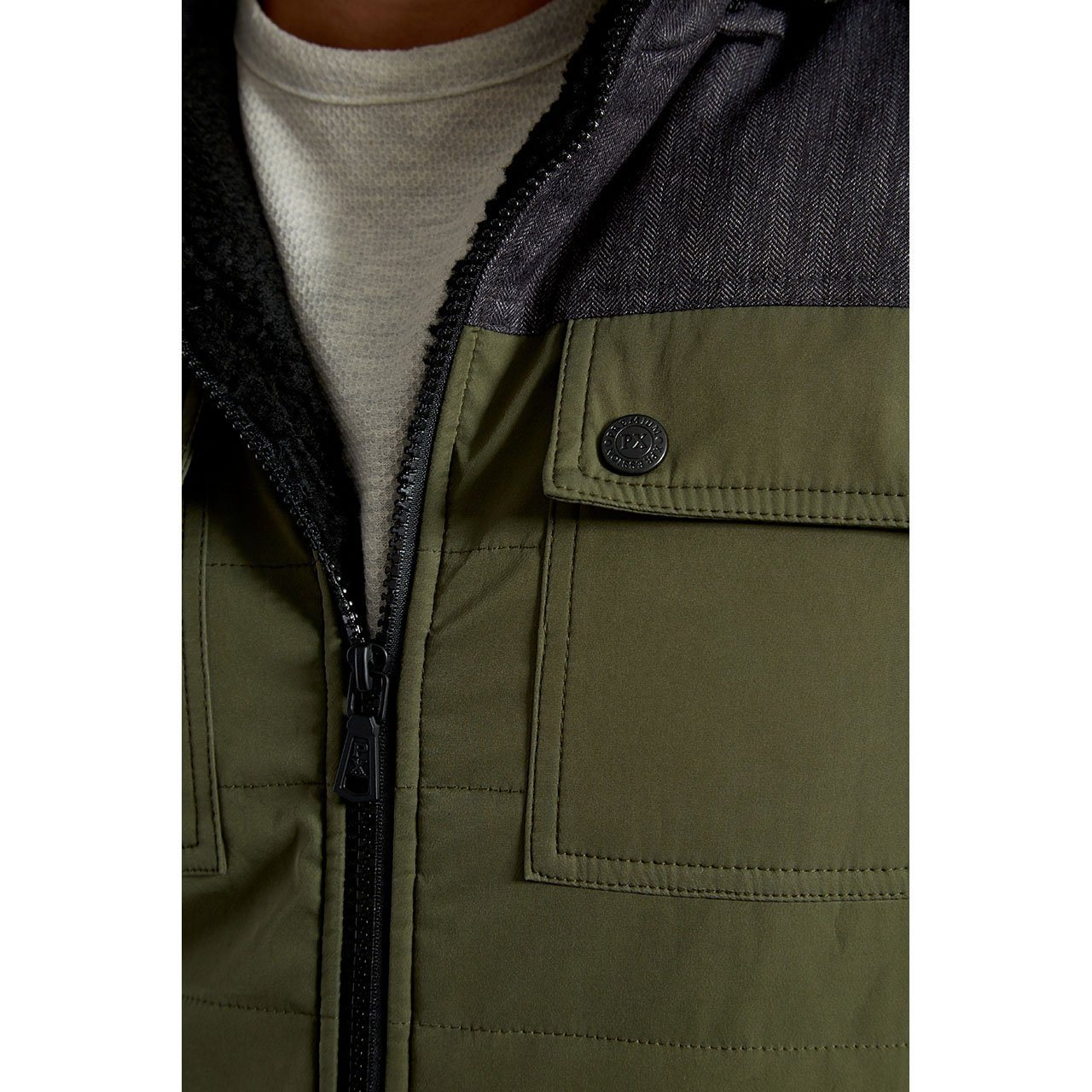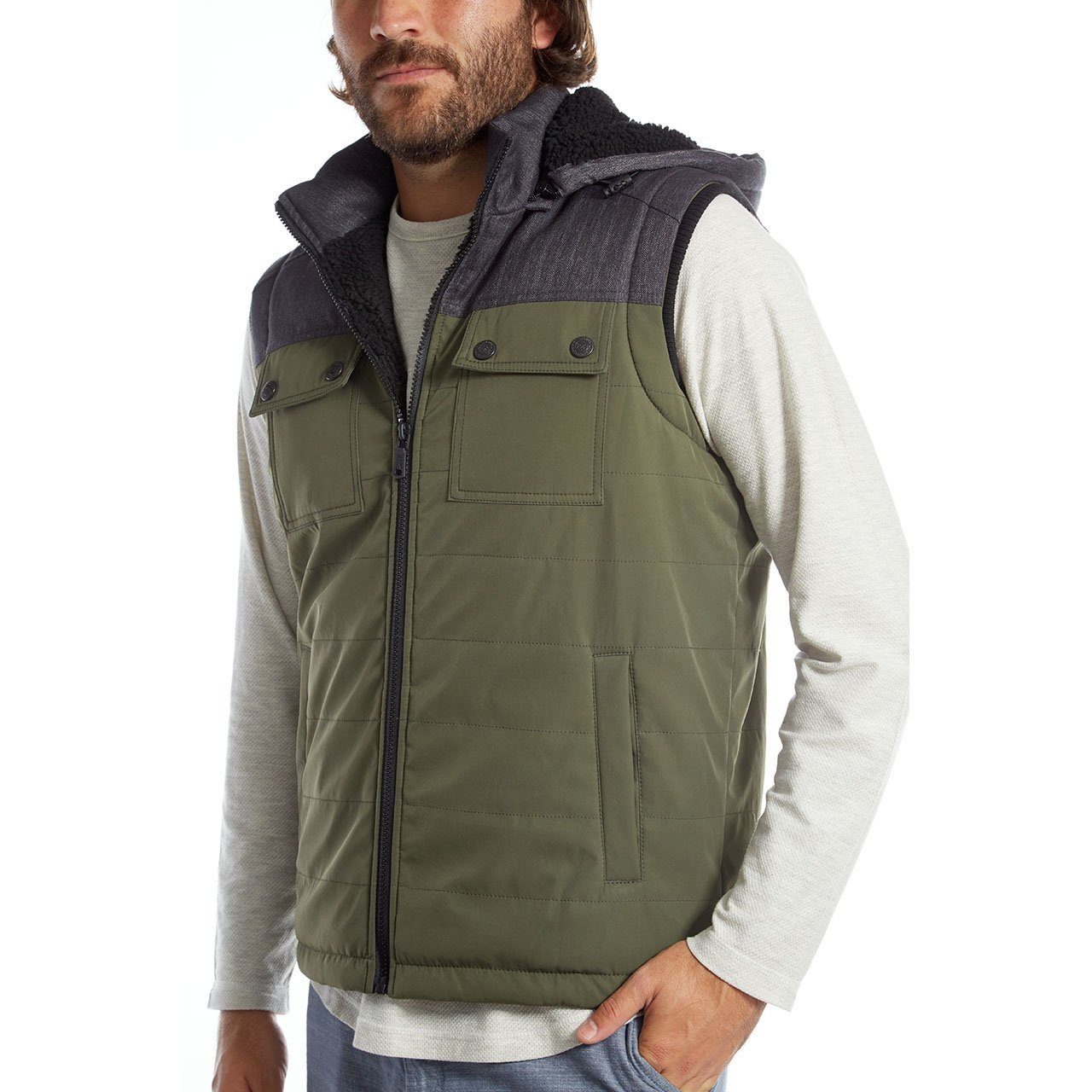 Nylon two-tone vest made in China featuring patch pockets and herringbone-micro-poly blend lining. Accurate sizing. 100% polyester.