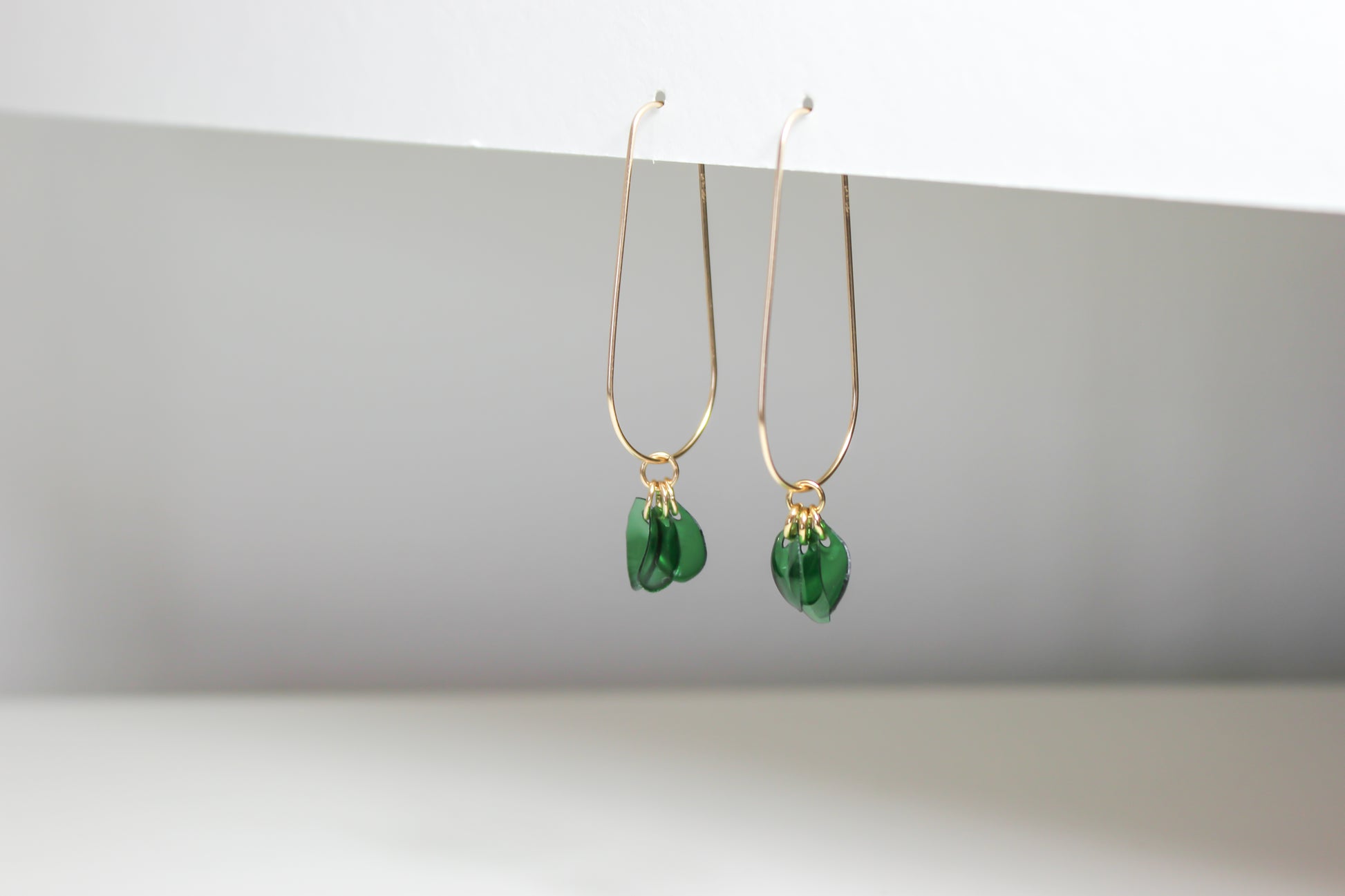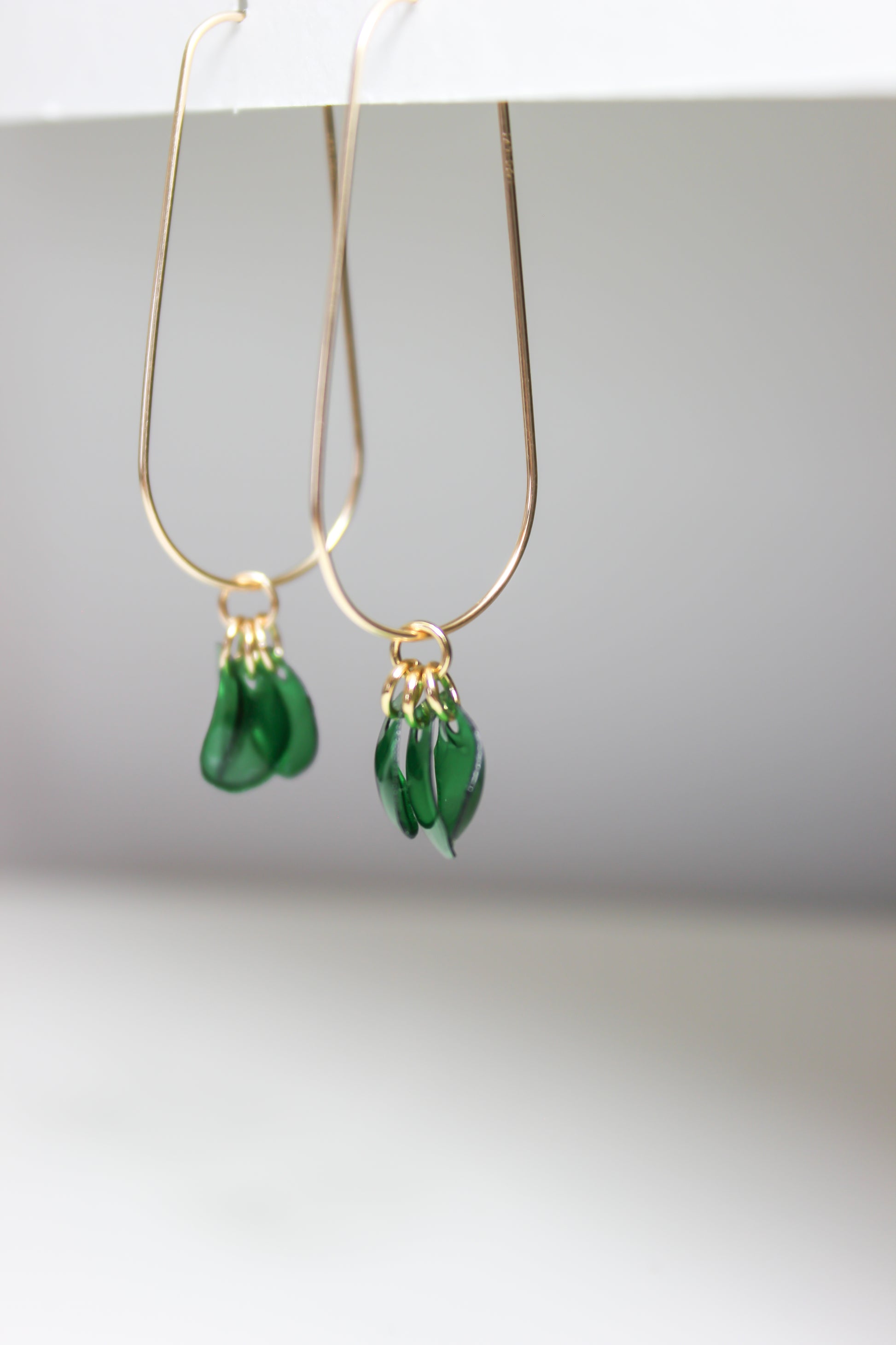 Sustainable 14k gold filled drops with emerald petals pendant. Also available in sterling silver. Handmade with recycled metals and upcycled bottles in Arlington, VA. Lightweight and versatile. Dimensions are 1.5x1.75 inches.