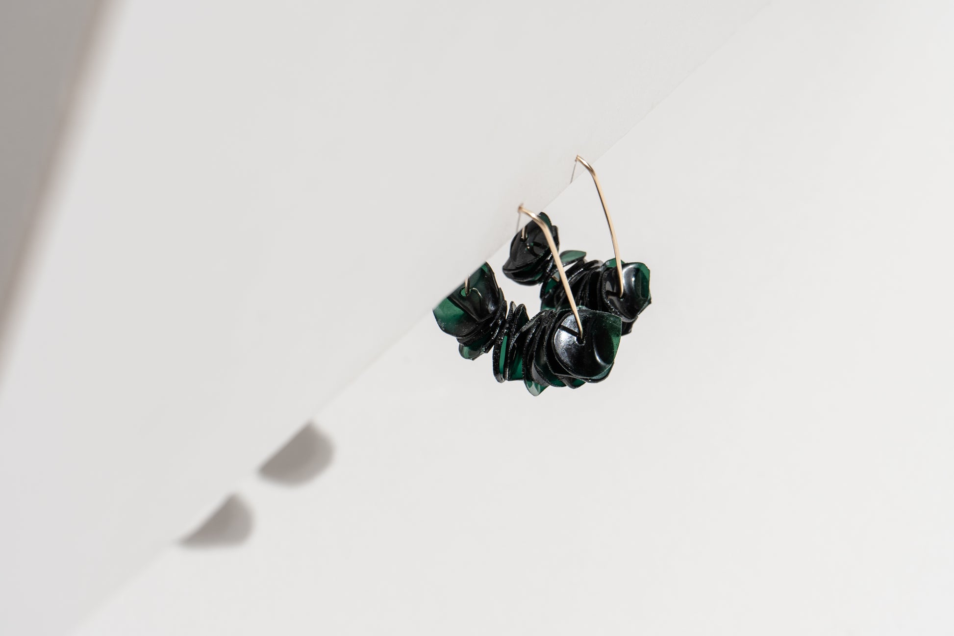 Sustainable 14k gold filled drops with dark green petals. Also available in sterling silver. Handmade with recycled metals and upcycled bottles in Arlington, VA. Light weight and fun. Dimensions are 1x1.5 inches.