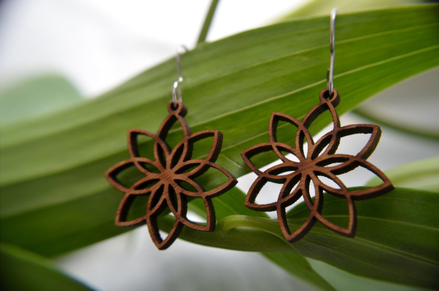 GioGio Jewelry's Natural Collection brings you Lotus Flower Earrings made with cherry wood.1" laser cut pieces with surgical steel ear wires make a stunning statement. Every design in the Collection celebrates nature's beauty, offering unique and fresh jewelry crafted from alternative materials. Enjoy the timeless elegance of stainless steel and leather with a sophisticated, clean finish.