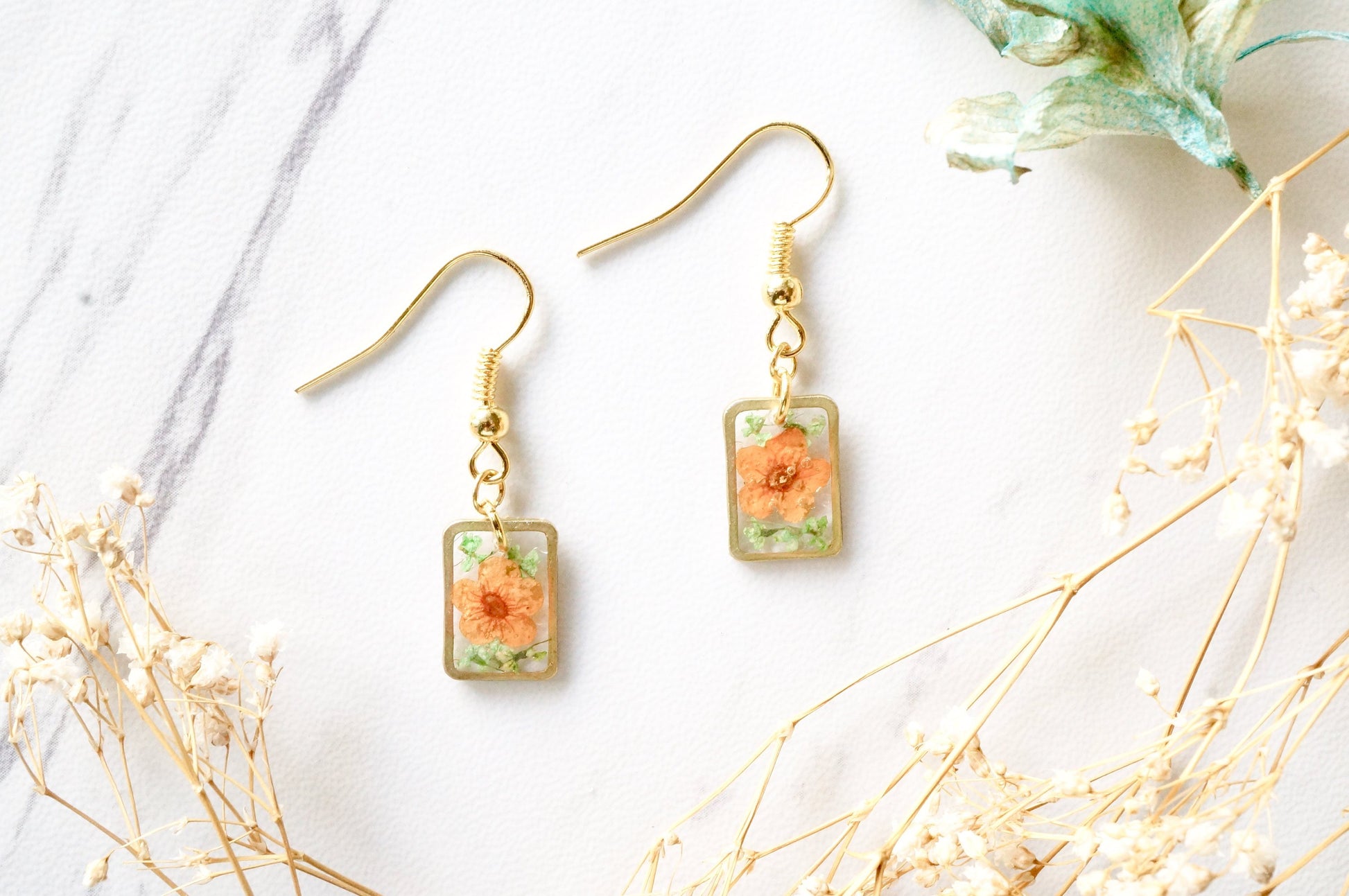 Real Dried Flowers and Resin Earrings, Gold Rectangle Drops in Orange and Green