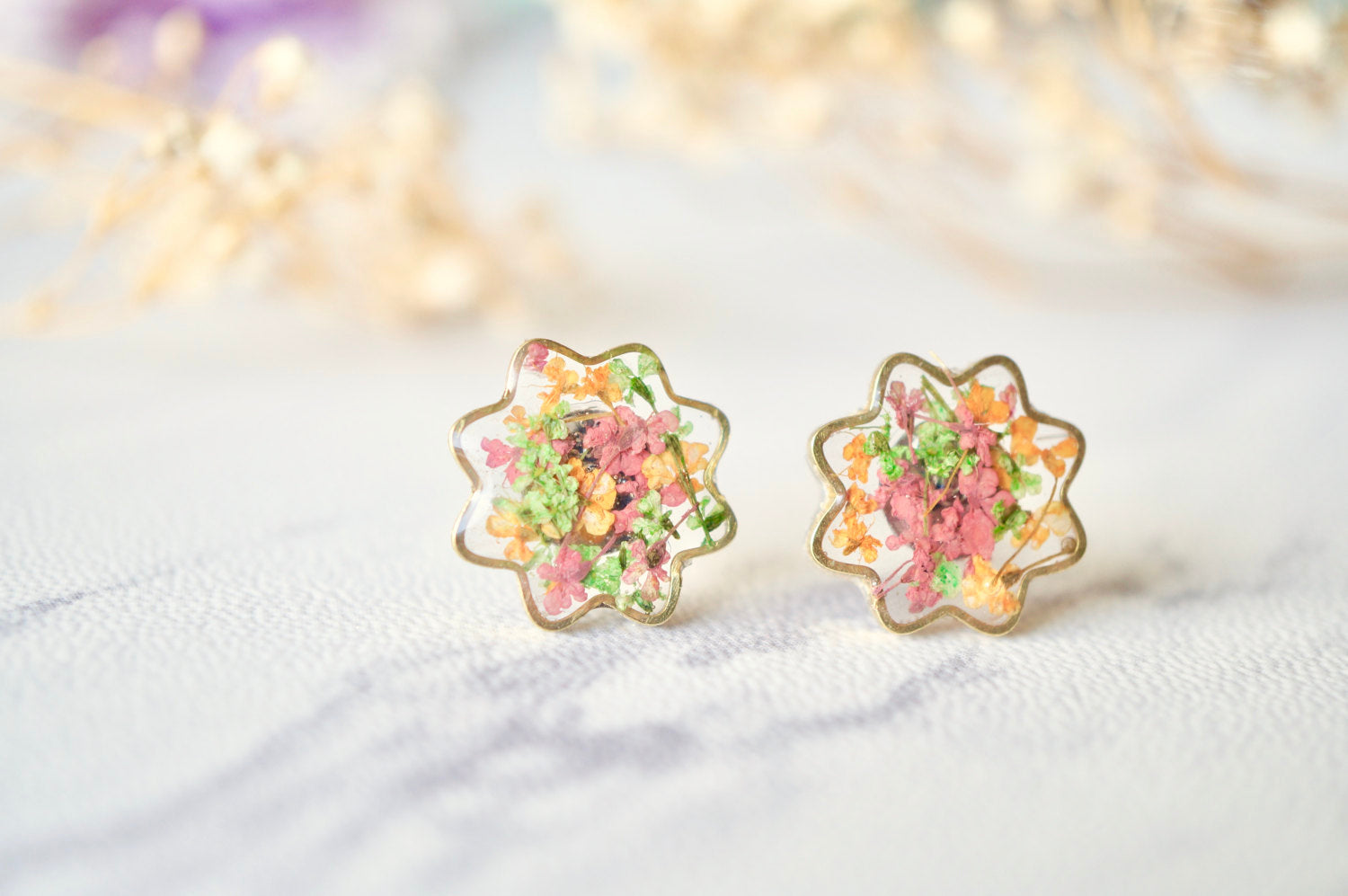 Real Dried Flowers and Resin Flower Stud Earrings in Pink Green Orange Mix